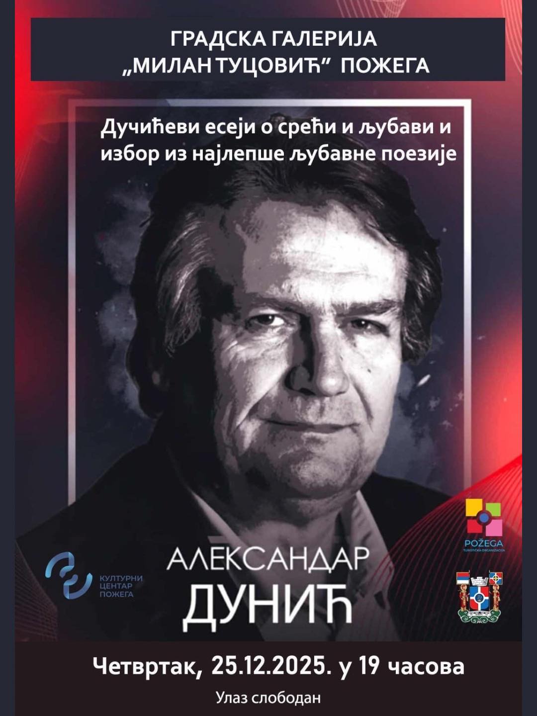 U okviru manifestacije „Požezija“, u četvrtak, 25. decembra u 19 časova, u Gradskoj galeriji „Milan Tucović“ u Požegi, biće održano posebno poetsko veče posvećeno Jovanu Dučiću.